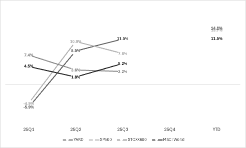 This performance comes amid a global equity rally driven by optimism around AI adoption, easing inflation pressures, and expectations of central bank rate cuts. The S&P 500 posted its strongest third quarter since 2020, while European markets saw modest gains amid geopolitical uncertainty. Technology and AI-related sectors have been key growth drivers, benefiting funds with diversified exposure and tactical positioning areas where YARD has demonstrated strength.